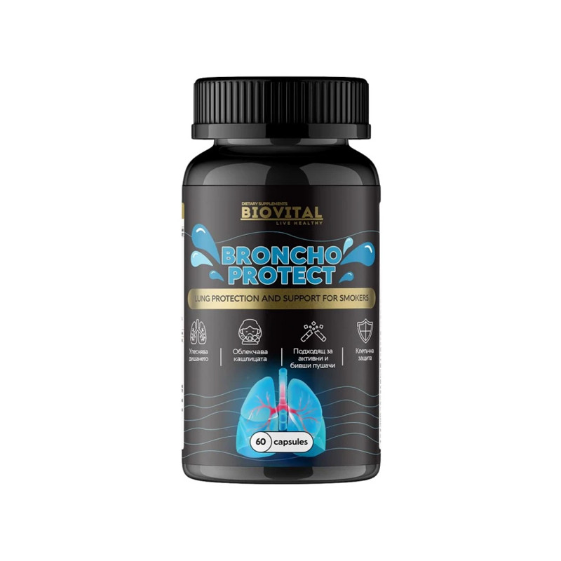 Broncho Protect е специализирана хранителна добавка за подкрепа на дихателната система, подходяща при суха и влажна кашлица, усещане за тежест в гърдите и сезонни дихателни проблеми. Формулата подпомага естественото отделяне на секрети и прочистване на дихателните пътища. Особено полезна е за активни и бивши пушачи.