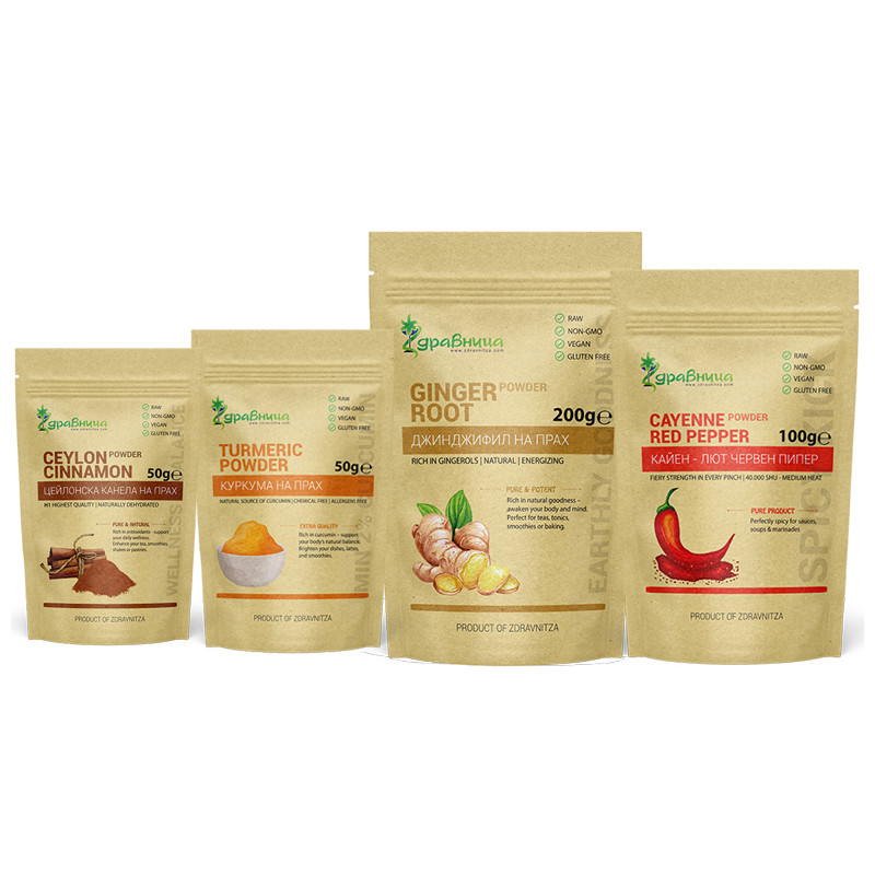 - Куркума + Джинджифил + Кайен пипер - класическа комбинация за къри, супи и затоплящи напитки