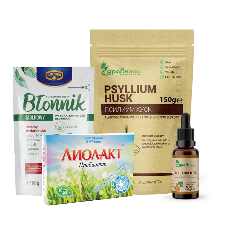 Здравословният пакет "Здрав стомах" включва: Ябълков пектин, Псилиум -люспи от индийски живовляк, Масло от кориандър и Лиолакт - Пробиотик.