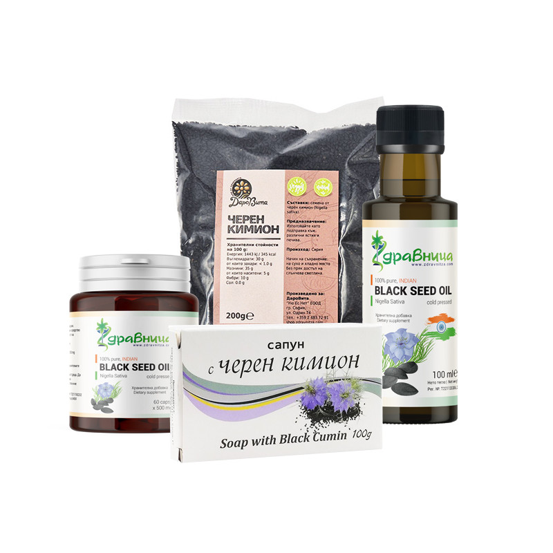 Черен кимион - Здравословен пакет е универсален комплект за цялостно укрепване на организма. Комбинира удобни форми на прием (течно, капсули и семена) и външна грижа (натурален сапун), които заедно или поотделно допринасят за: