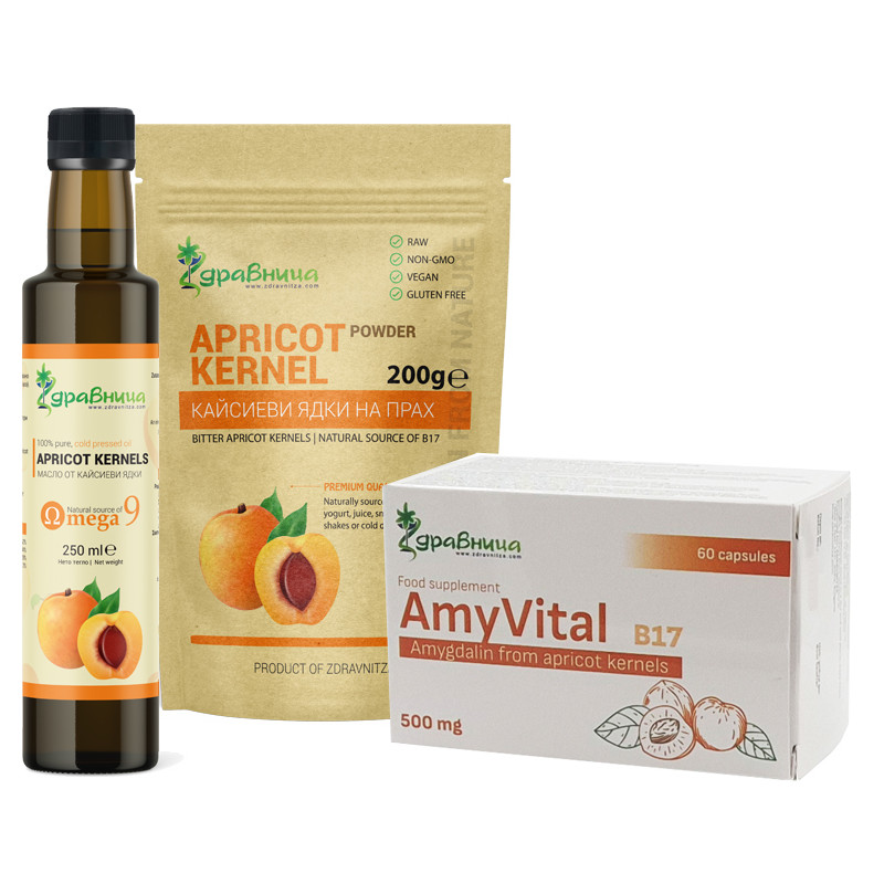 Здравословният пакет "Кайсиеви ядки" включва: АмиВитал В17 - амигдалин от кайсиеви ядки, Здравница, 60 капсули, Горчиви кайсиеви ядки на прах, Здравница, 200 гр. и Масло от кайсиеви ядки, студено пресовано, Здравница, 250 мл.
