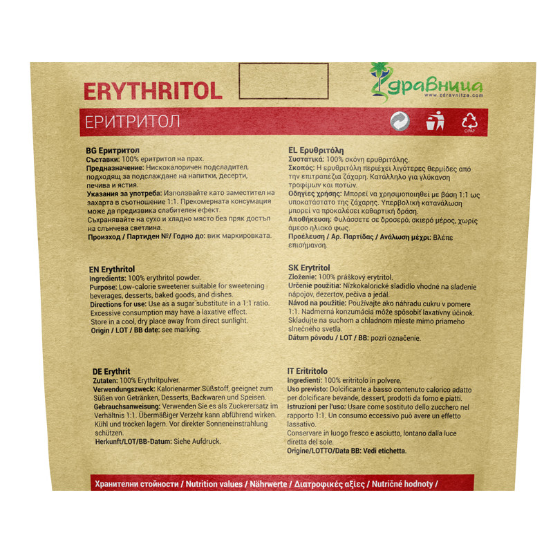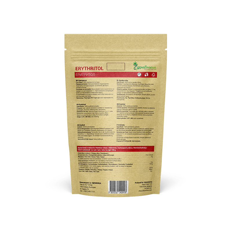Еритритолът е естествено срещащ се захарен алкохол и нискокалоричен подсладител, широко използван като заместител на захарта. Има чист, сладък вкус с почти никакъв остатъчен послевкус, което го прави идеален за печене, напитки и ежедневна употреба.