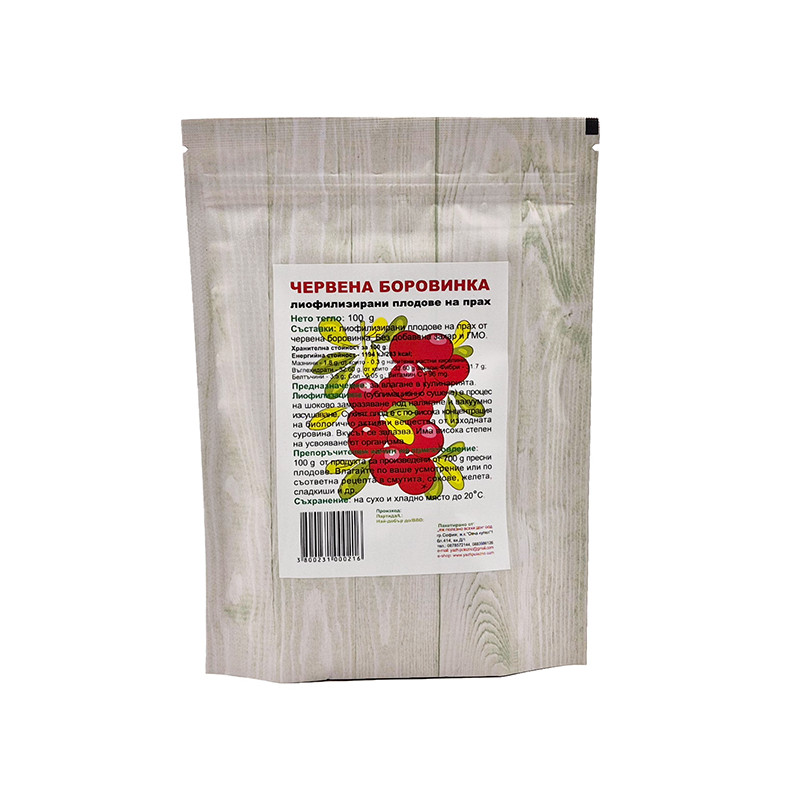 Лиофилизираната червена боровинка на прах е естествен източник на витамини, антиоксиданти и фибри. Тя е особено богата на витамин C, който подпомага имунната система и защитава клетките от оксидативен стрес. Съдържа проантоцианидини - растителни съединения, които допринасят за здравето на пикочните пътища и предотвратяват развитието на инфекции. Червената боровинка подпомага сърдечно-съдовото здраве, като спомага за поддържане на нормални нива на холестерола. Антиоксидантите ѝ подпомагат детоксикацията и забавят процесите на стареене. Благодарение на естествената си киселинност, тя стимулира храносмилането и подобрява метаболизма.