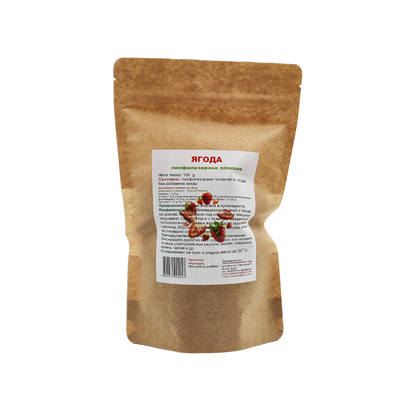 Лиофилизирани плодове от ягоди. Без добавена захар! Не съдържа технологични добавки или вредни вещества.