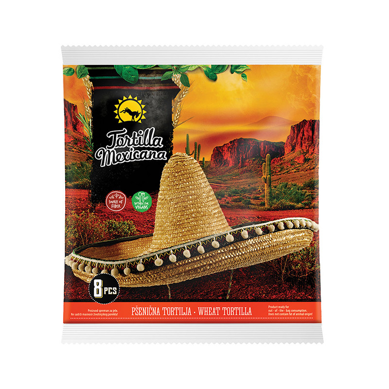 Пшеничната тортила е съвременна интерпретация на класическата мексиканска тортила. Създадена с пшенично брашно (≈66%), тя съчетава мекота, еластичност и удобство за бързи и вкусни ястия. Тази версия се предлага в опаковка от 8 тортили с диаметър 20 см, идеална за семейни закуски, обяд или вечеря.