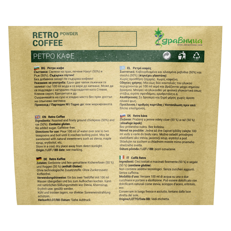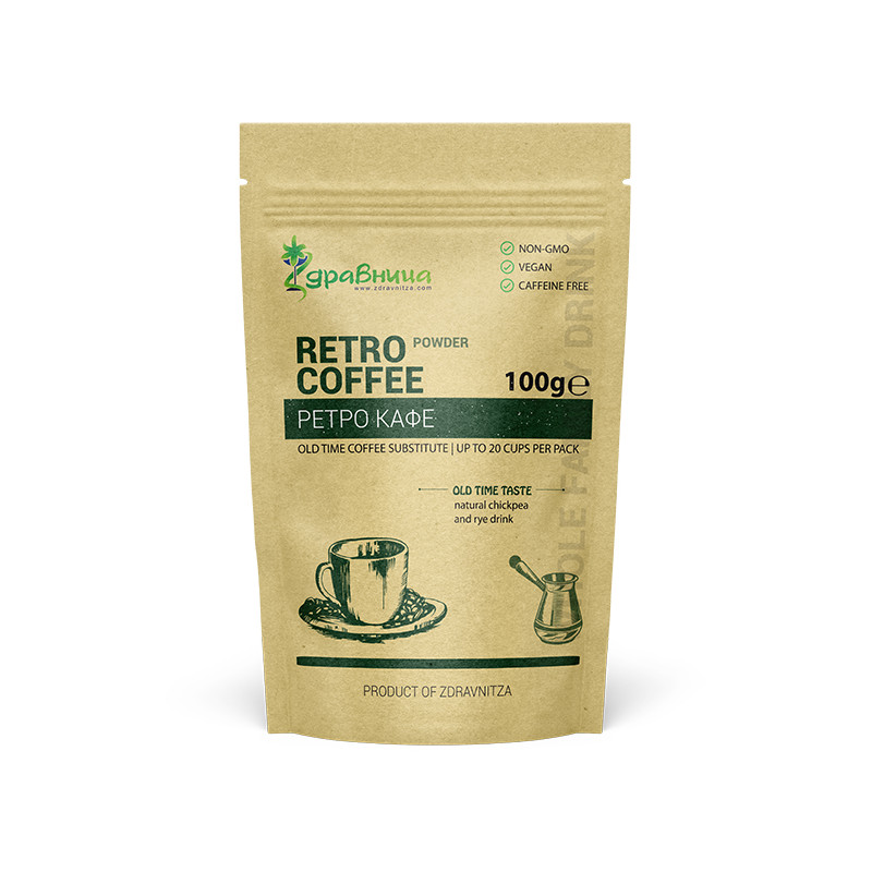 Ретро кафе е натурален, растителен заместител на кафето, приготвен от равни части печен нахут и ръж, фино смлени на прах.