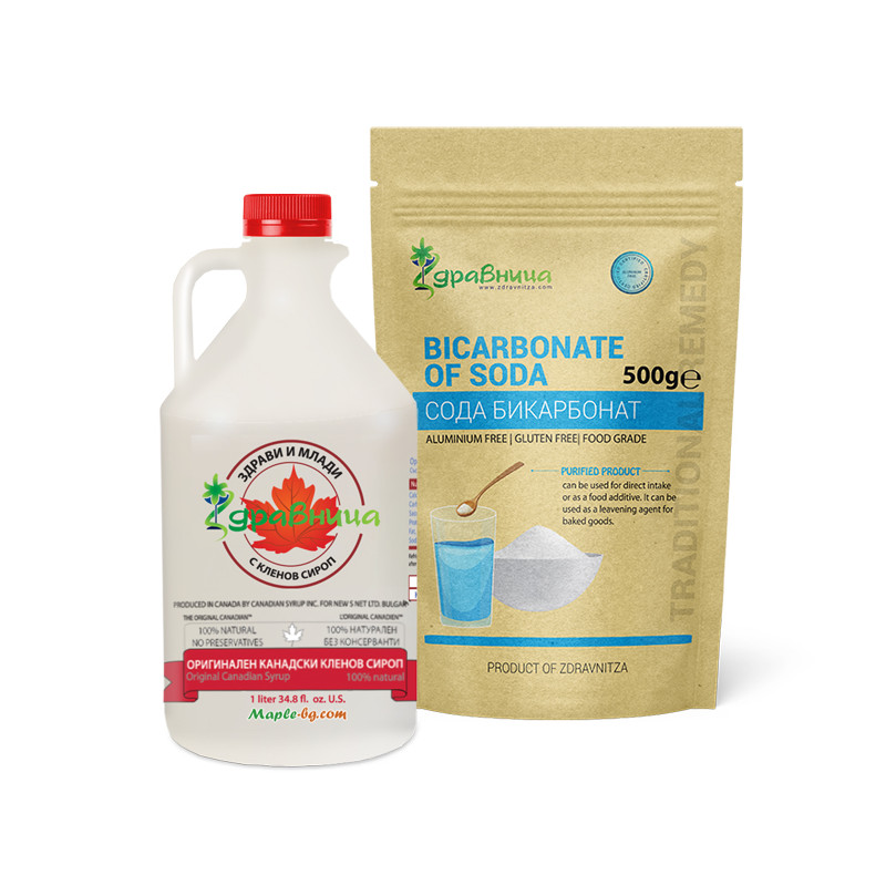 Healthy package "Maple syrup and Soda" includes: Original Canadian Maple Syrup, Zdravnitza - 1 liter, Bicarbonate of soda, Aluminum Free, Zdravnitza - 500 g.