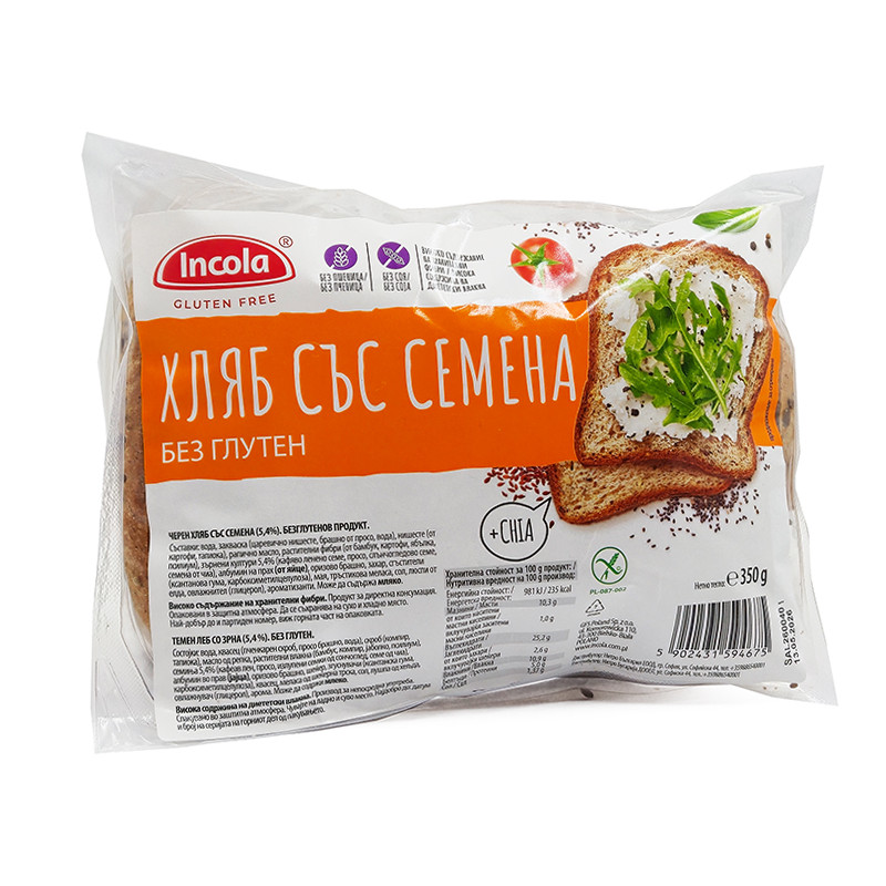 Water, sourdough (corn starch, millet flour, water), starch (potato, tapioca), rapeseed oil, plant fibres (bamboo, potato, apple, psyllium), grains 5.4% (brown flaxseed, millet, sunflower seeds, chia seeds), egg white powder (egg), rice flour, sugar, thickeners (xanthan gum, carboxymethyl cellulose), yeast, cane molasses, salt, buckwheat flakes, humectant (glycerol), flavourings. May contain traces of milk.